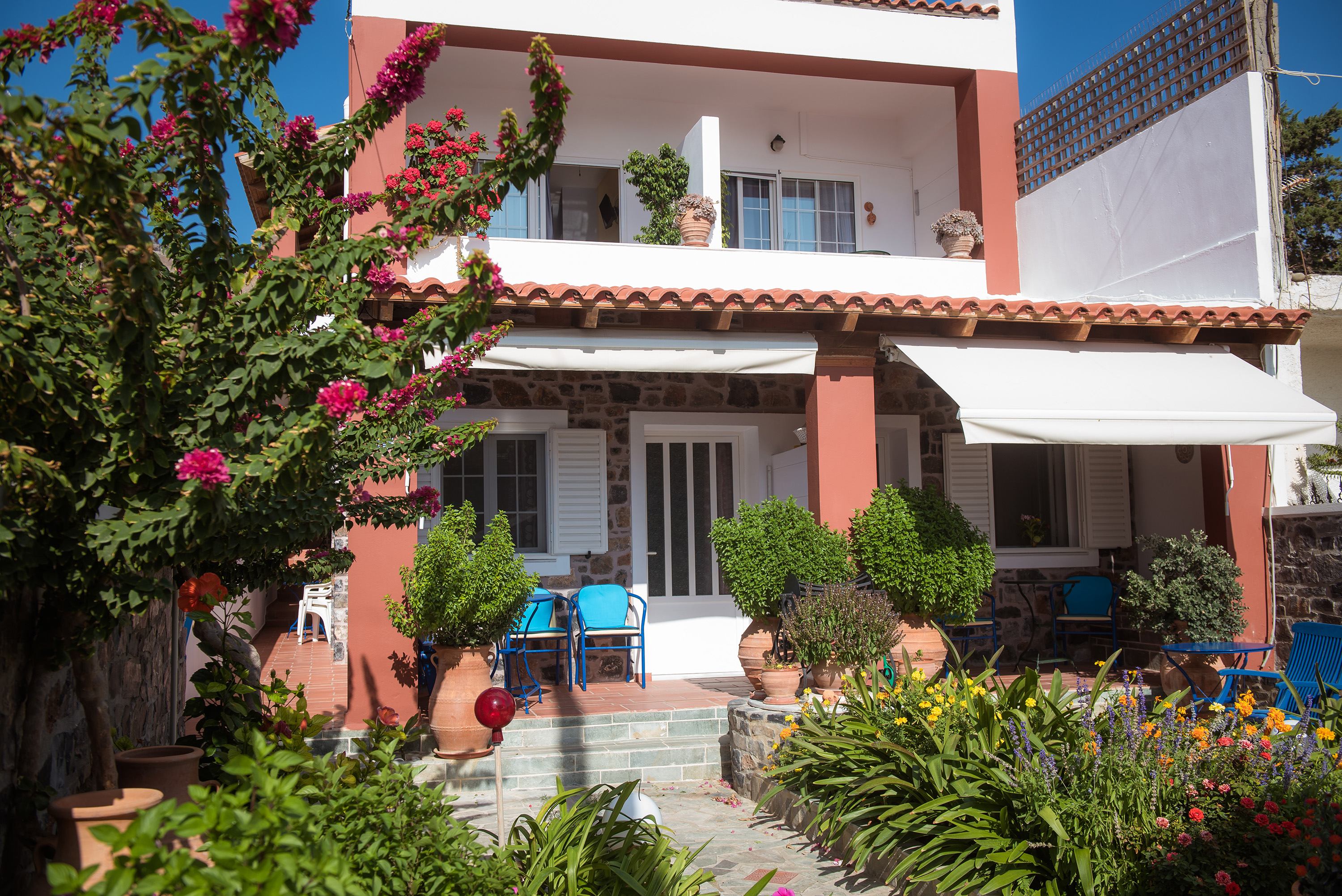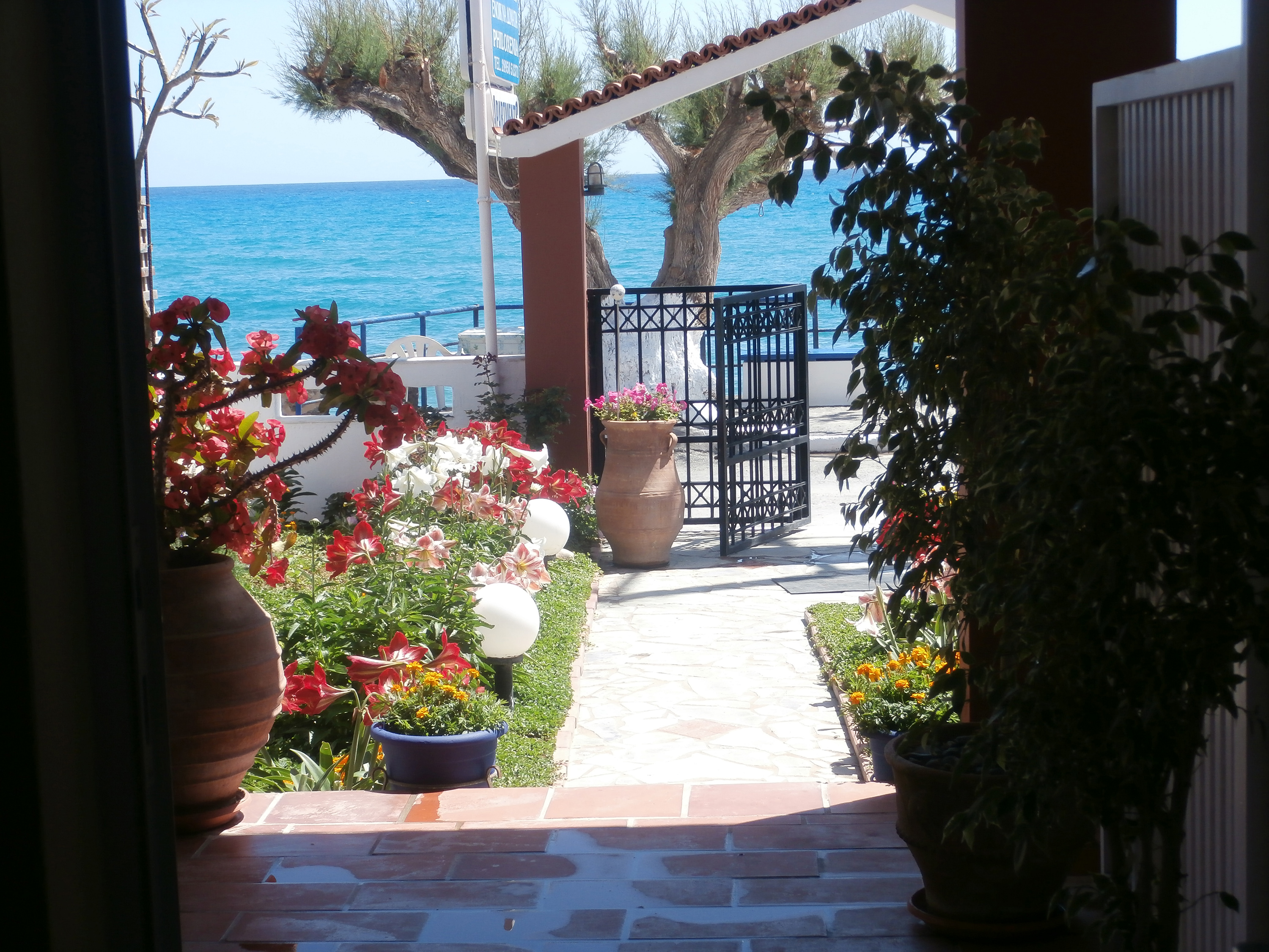 Philoxenia Apartments is a complex of apartments that compliment the natural area and warm, welcoming style of Crete. Built on the edge of the sea and lovingly cared for, it has stone details that blend harmoniously with nature. The beautiful scene is complemented by the ever blooming and colourful gardens encloses the complex.